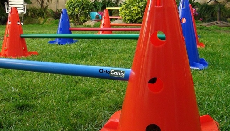 It involves placing small cones, bars or cushions on the floor for the dog to get around by walking over them. This exercise Improves leg lift, body awareness, and balance.
