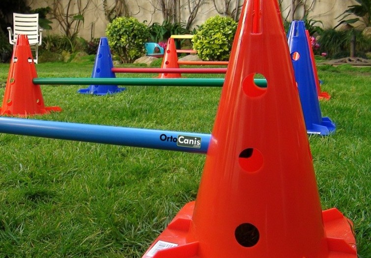 Se trata de colocar pequeños conos, barras o cojines en el suelo para que el perro los sortee caminando por encima. Este ejercicio mejora la elevación de las patas, la consciencia corporal y el equilibrio.