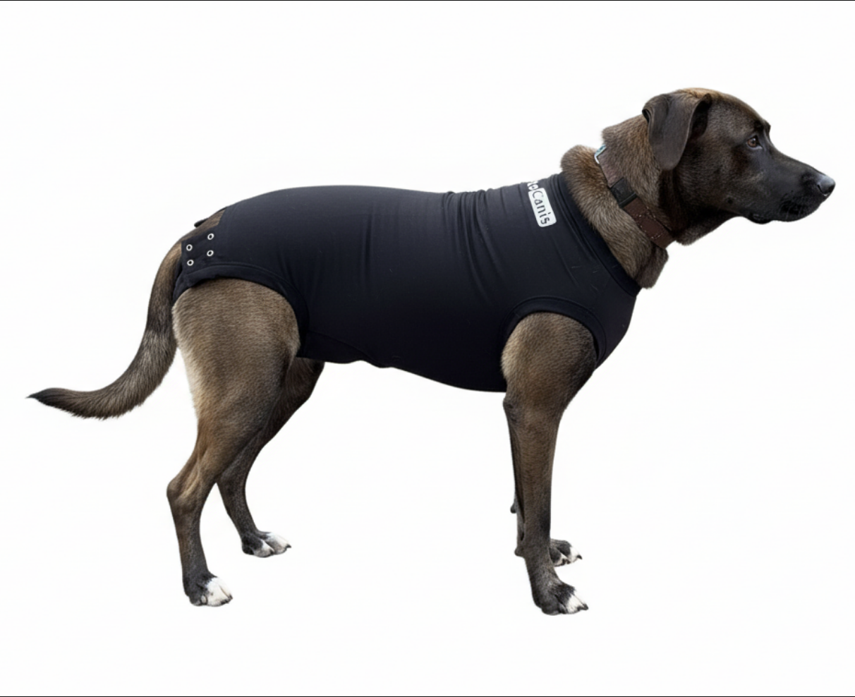 Fabricat amb material elàstic, transpirable i hipoal·lergènic, s'adapta al cos del gos sense causar irritacions ni restringir la seva mobilitat. El seu disseny anatòmic cobreix la zona abdominal, toràcica o genital segons la intervenció, garantint una protecció total. A més, compta amb tancaments segurs i fàcils d'ajustar, que permeten posar-lo i treure'l sense estrès per a la mascota.
